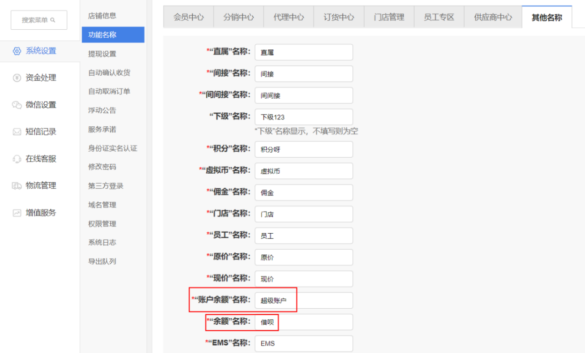 現(xiàn)邏輯:其他設(shè)置增加”余額”名稱自定義,手機(jī)端”余額”顯示跟隨系統(tǒng)設(shè)置變動