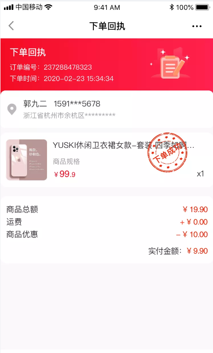 現(xiàn)邏輯:款成功后,手機(jī)端訂單詳情增加”下單回執(zhí)”,點擊”下單回執(zhí)”可以生成一張圖片,顯示”下單成功”,圖片中顯示訂單編號、下單時間、收貨人、地址、商品及規(guī)格、數(shù)量、總額、運費、實際支付金額。