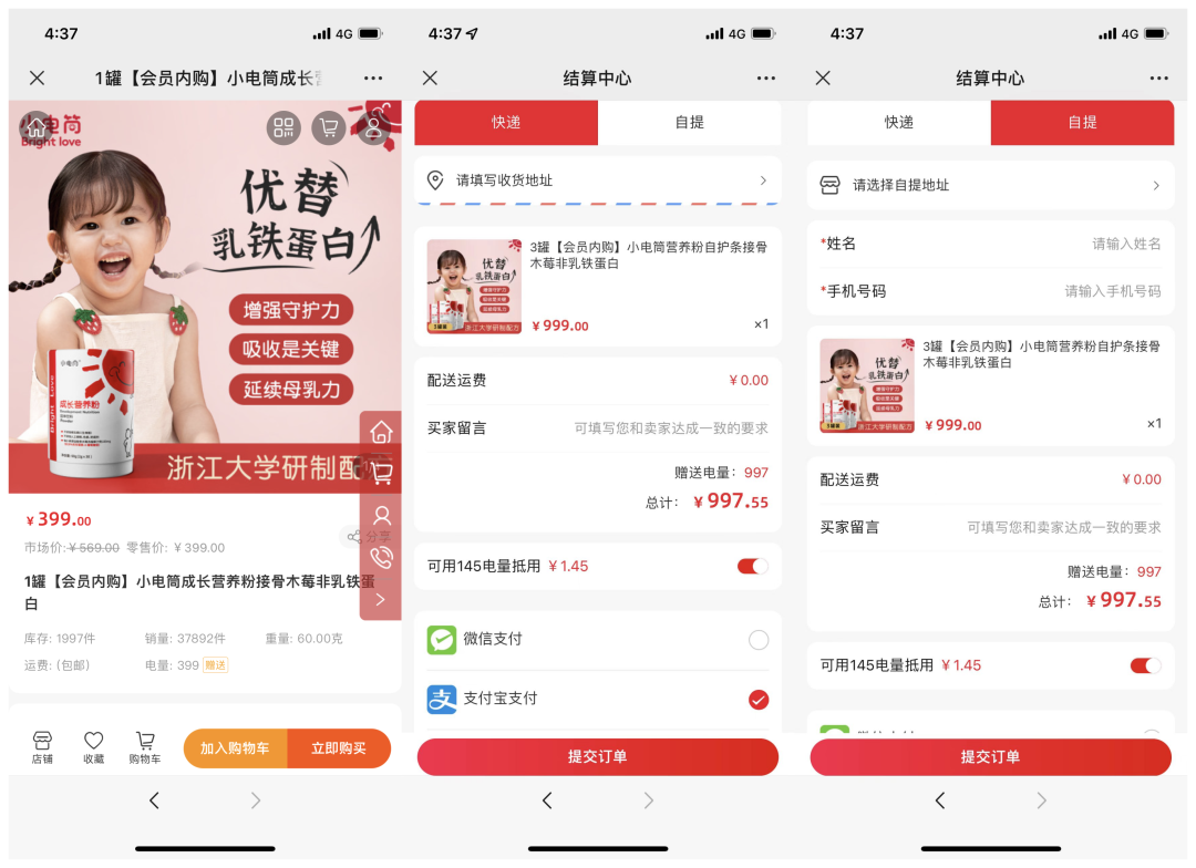 只要會員在小程序商城內下單后,會贈送等同訂單金額的積分,在下次下單后,積分可以抵現使用,會員可以選擇快遞的方式收貨也可以就近到店自提。