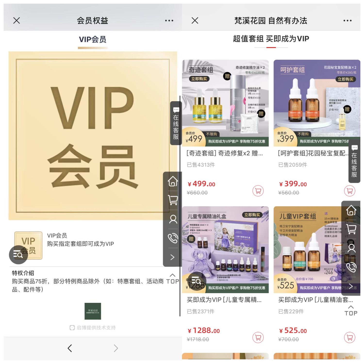 梵溪花園微商城除了通過上線各種促銷活動提升商城流量轉化外,在微商城內還上架了新人專享優惠商品,用戶購買指定禮包即可升級為商城VIP,享受75折優惠,除部分特例商品外(特惠套組、活動商品、配件等),多方式拓客拉新,營造購物氛圍帶來更多銷量。