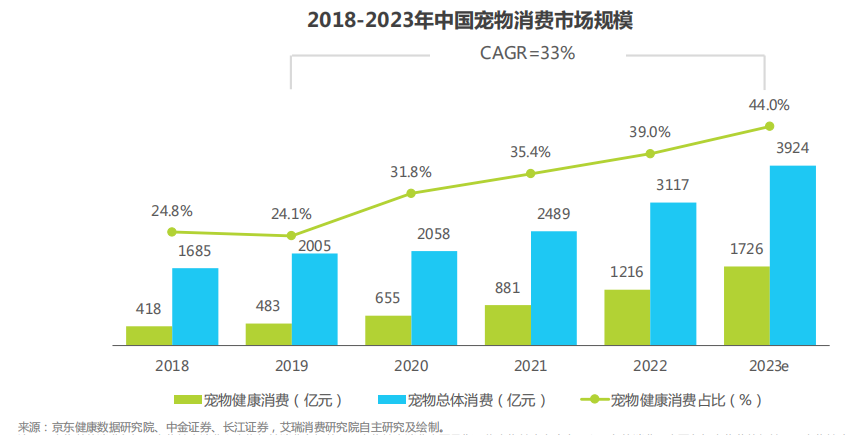 隨著國(guó)民收入水平的提升,消費(fèi)不斷升級(jí),同時(shí)人口結(jié)構(gòu)發(fā)生變化,養(yǎng)寵人群不斷增加,寵物角色和養(yǎng)寵理念也發(fā)生轉(zhuǎn)變,寵物主消費(fèi)觀念也向著品質(zhì)化進(jìn)行升級(jí)。寵物相關(guān)商品和服務(wù)需求越發(fā)多樣,國(guó)內(nèi)寵物消費(fèi)市場(chǎng)規(guī)模快速增長(zhǎng),2022年市場(chǎng)規(guī)模約為3117億元。隨著寵物家庭滲透率和行業(yè)成熟度持續(xù)提升,寵物消費(fèi)市場(chǎng)未來依然會(huì)保持增長(zhǎng)態(tài)勢(shì),預(yù)計(jì)2023年市場(chǎng)規(guī)模約為3924億元,2019年-2023年復(fù)合增長(zhǎng)率可達(dá)33%。